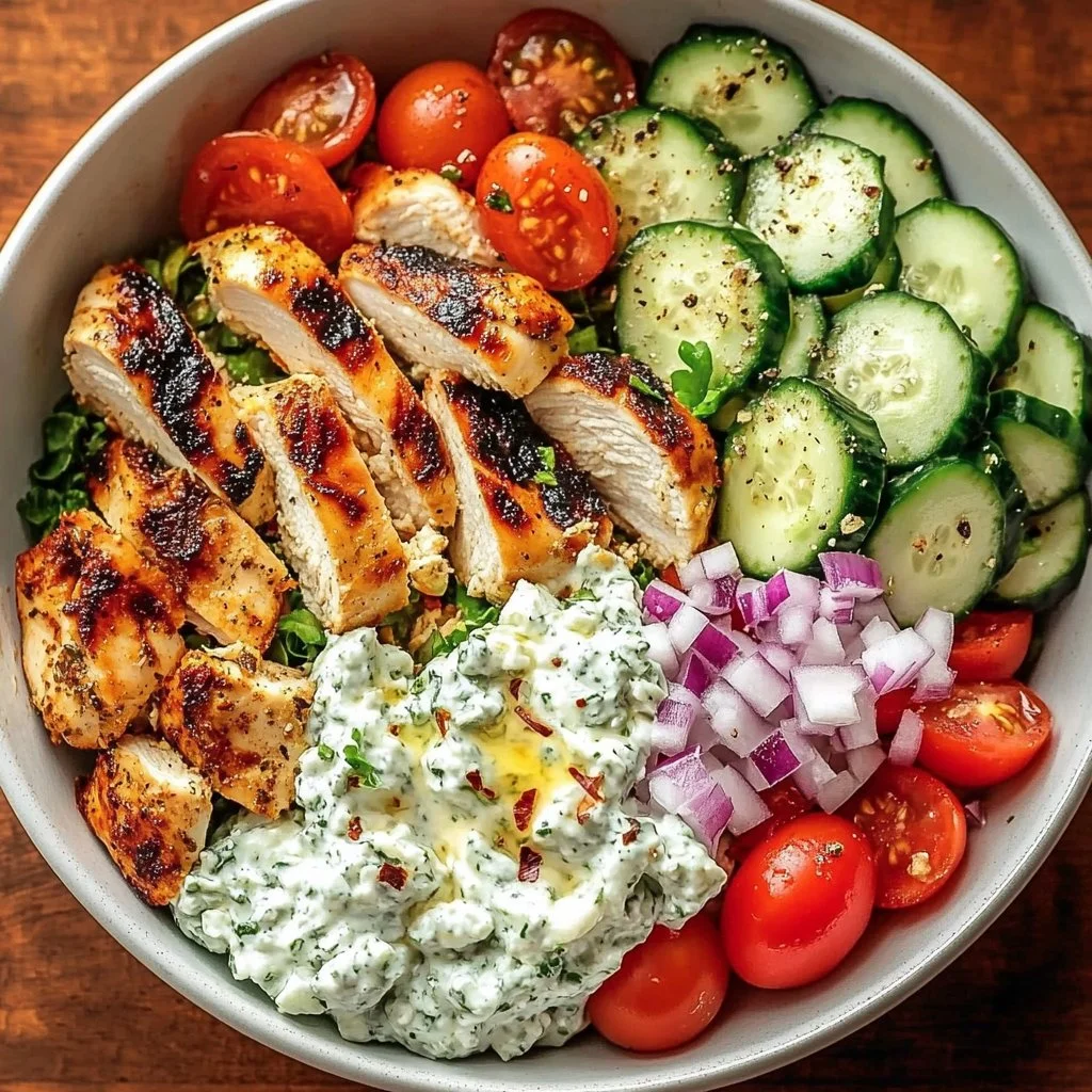 A vibrant and satisfying dish featuring marinated chicken, fresh vegetables, and creamy tzatziki, perfect for any occasion.