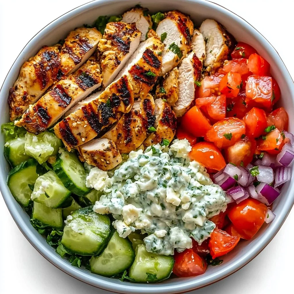 A quick and wholesome Greek chicken bowl featuring tender chicken, fluffy quinoa, fresh veggies, and a cooling tzatziki sauce.